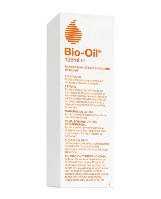 Bio-Oil® es un producto especializado para el cuidado de la piel, formulado para ayudar a mejorar la apariencia de cicatrices, estrías y manchas en la piel. Su fórmula única, que contiene el revolucionario ingrediente PurCellin Oil™, es también altamente efectiva para pieles con síntomas de envejecimiento y deshidratación.