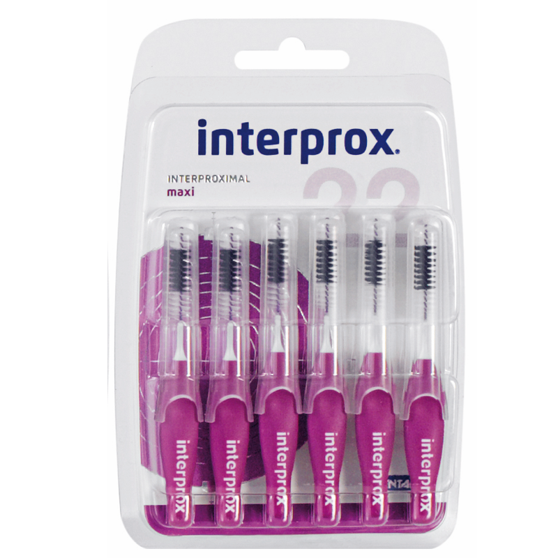 El cepillo Interprox® Maxi está diseñado para limpiar eficazmente los espacios interproximales y ayuda a proteger contra la caries y la enfermedad periodontal. Gracias a sus filamentos de Tynex®, este cepillo permite detectar puntos de sangrado (filamentos blancos) y zonas con biofilm dental (filamentos negros).